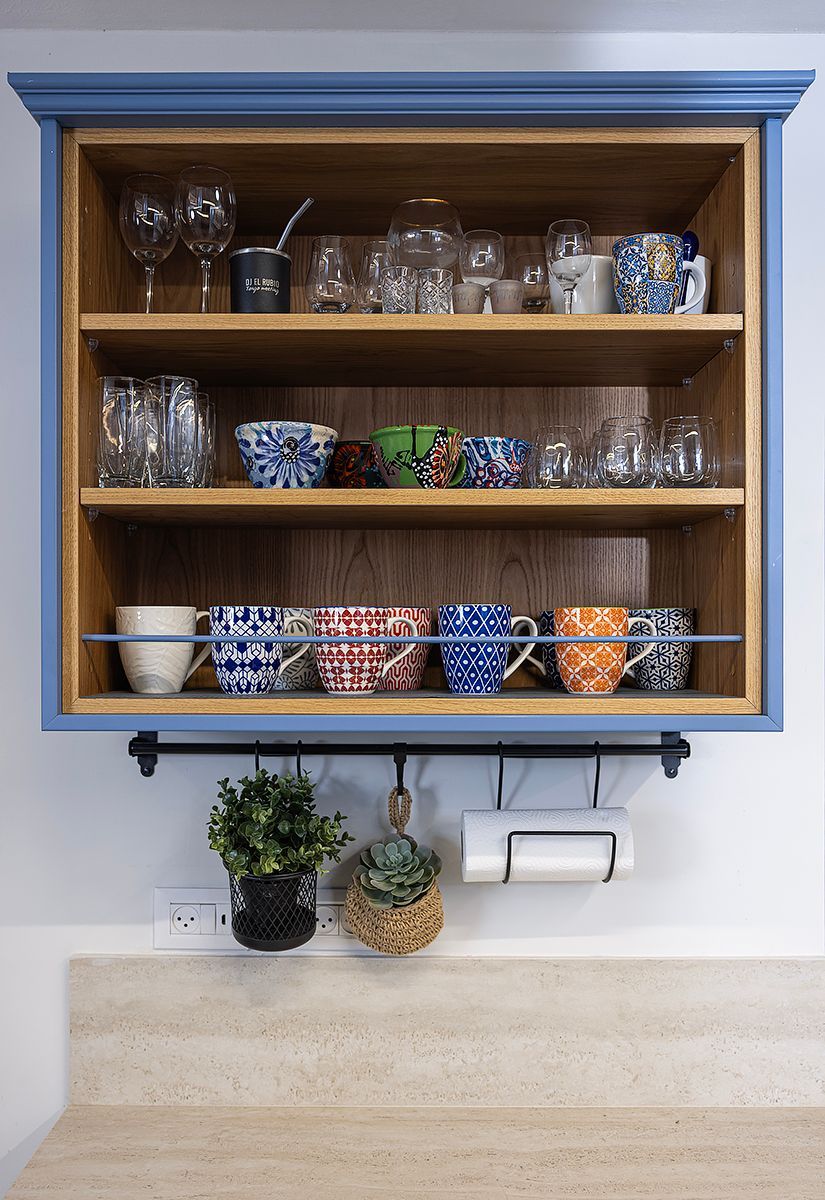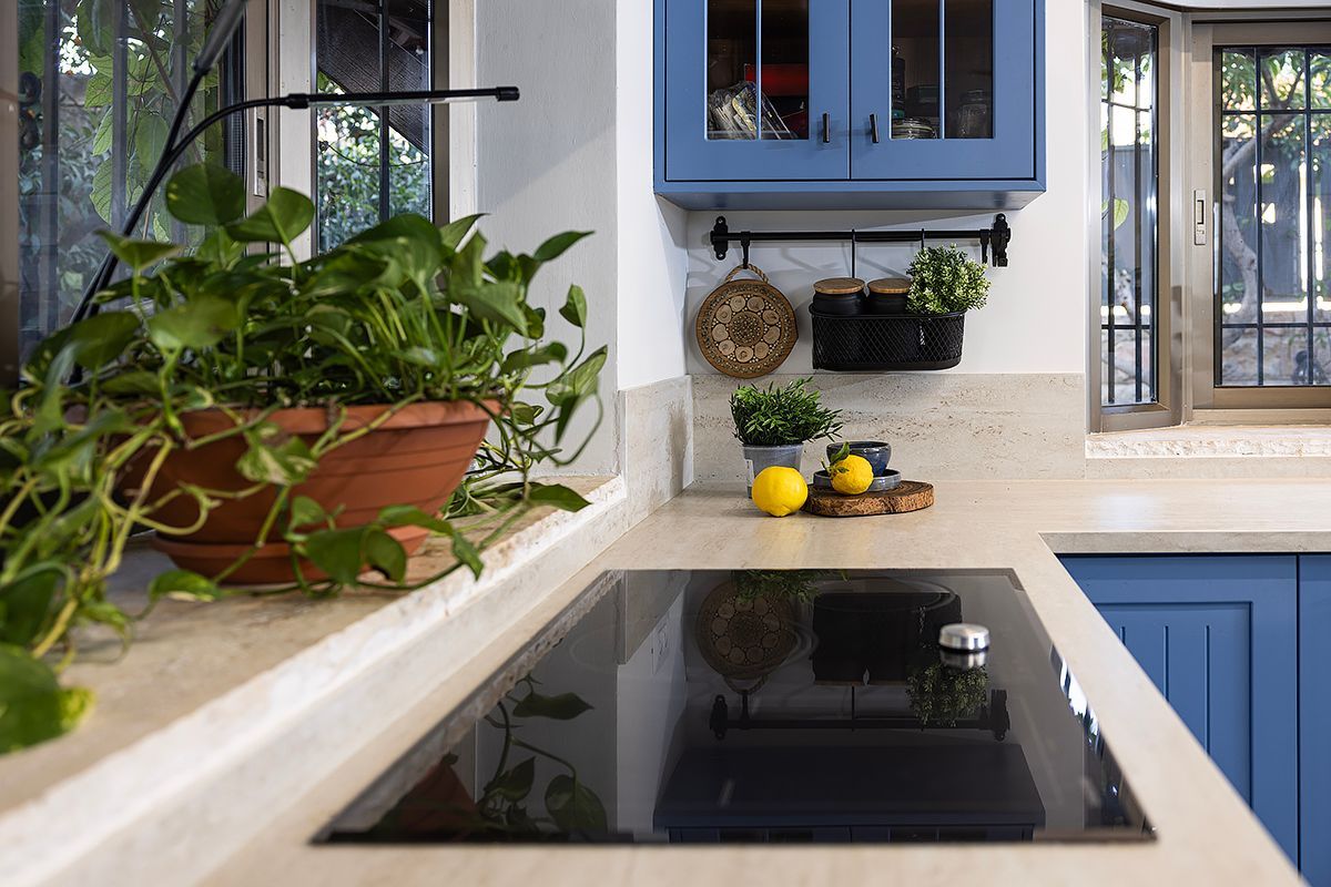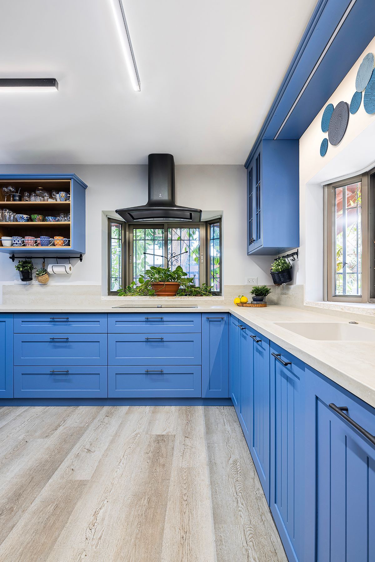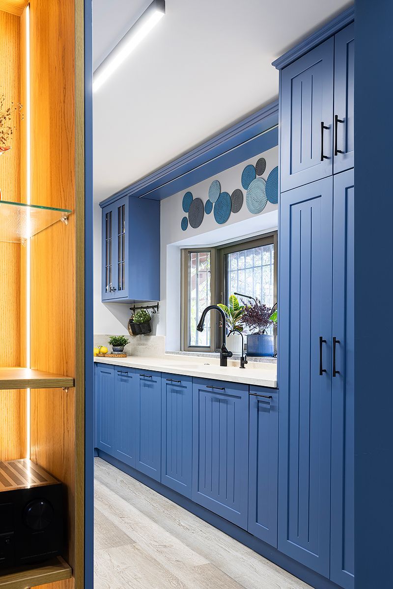עיצוב הבית הפרטי הזה מאופיין באתגרים תכנוניים. העברנו את הקיר הגבוה של המטבח למרכז. באותו מקום קם מרכז אלקטרוני של מערכת קולנוע ביתי עם רמקולים מתפרסים על כל נחלל. ארון הכניסה עם תושבת נוחה נבנה בצד השני. פינת אוכל עם ספסל מיוחד לפרוייקט זה. וכמובן, הצבעים הכחולים, בשילוב של גווני עץ, אלמנטים כפריים וקמין - הכל יחד יוצר חלל בולט בנוף הישראלי, מיוחד ורגוע.