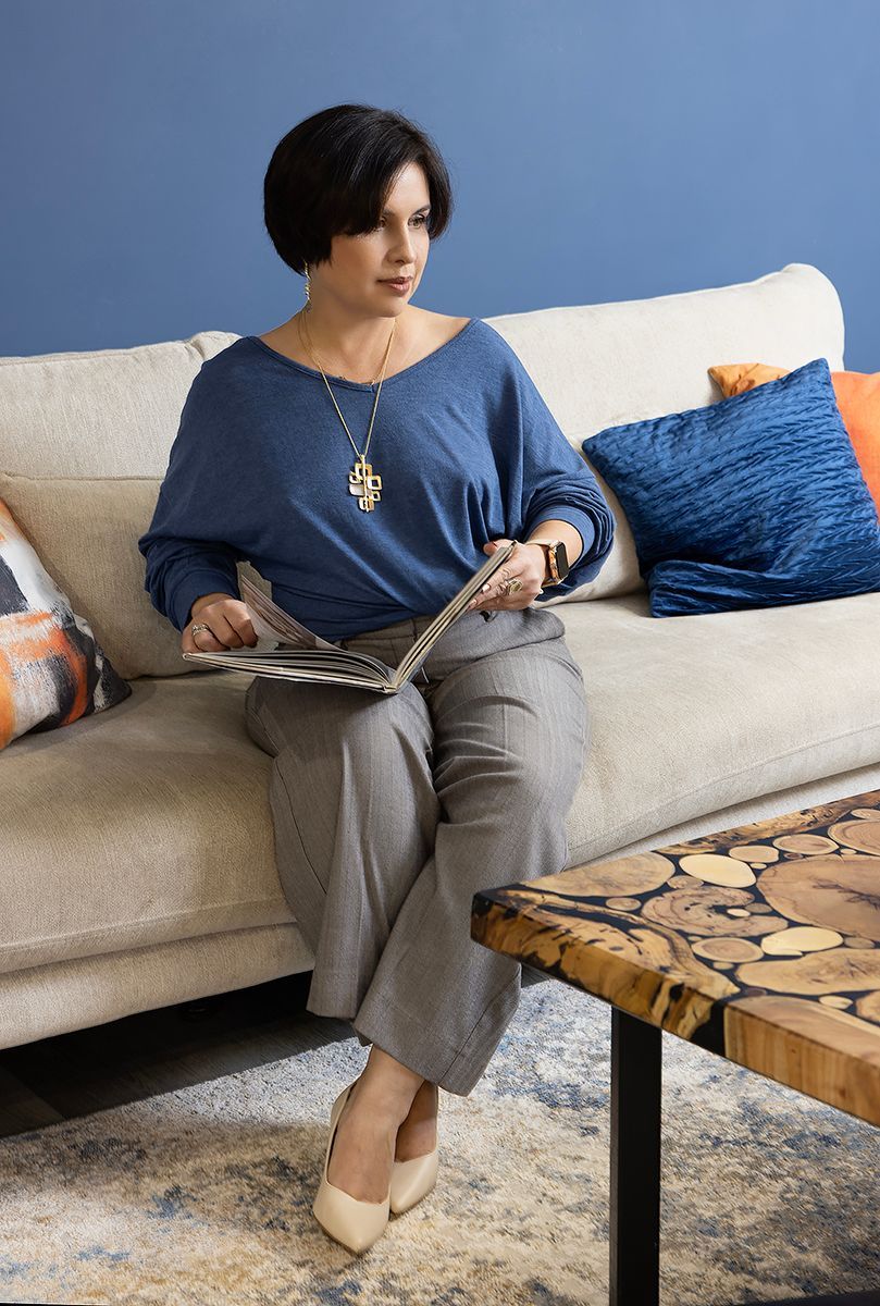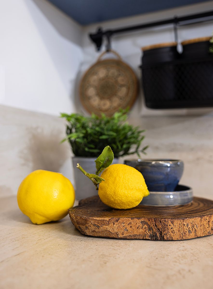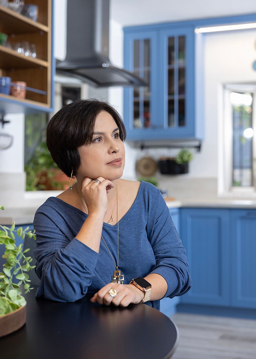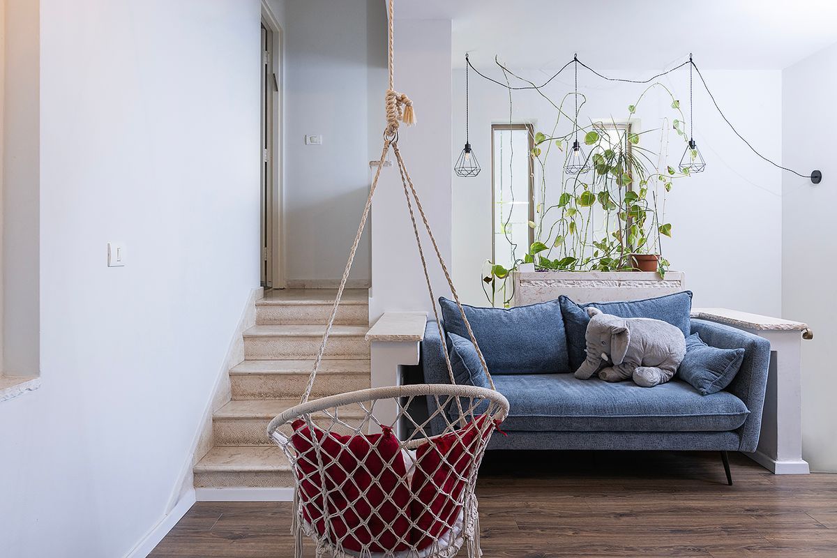 עיצוב הבית הפרטי הזה מאופיין באתגרים תכנוניים. העברנו את הקיר הגבוה של המטבח למרכז. באותו מקום קם מרכז אלקטרוני של מערכת קולנוע ביתי עם רמקולים מתפרסים על כל נחלל. ארון הכניסה עם תושבת נוחה נבנה בצד השני. פינת אוכל עם ספסל מיוחד לפרוייקט זה. וכמובן, הצבעים הכחולים, בשילוב של גווני עץ, אלמנטים כפריים וקמין - הכל יחד יוצר חלל בולט בנוף הישראלי, מיוחד ורגוע.